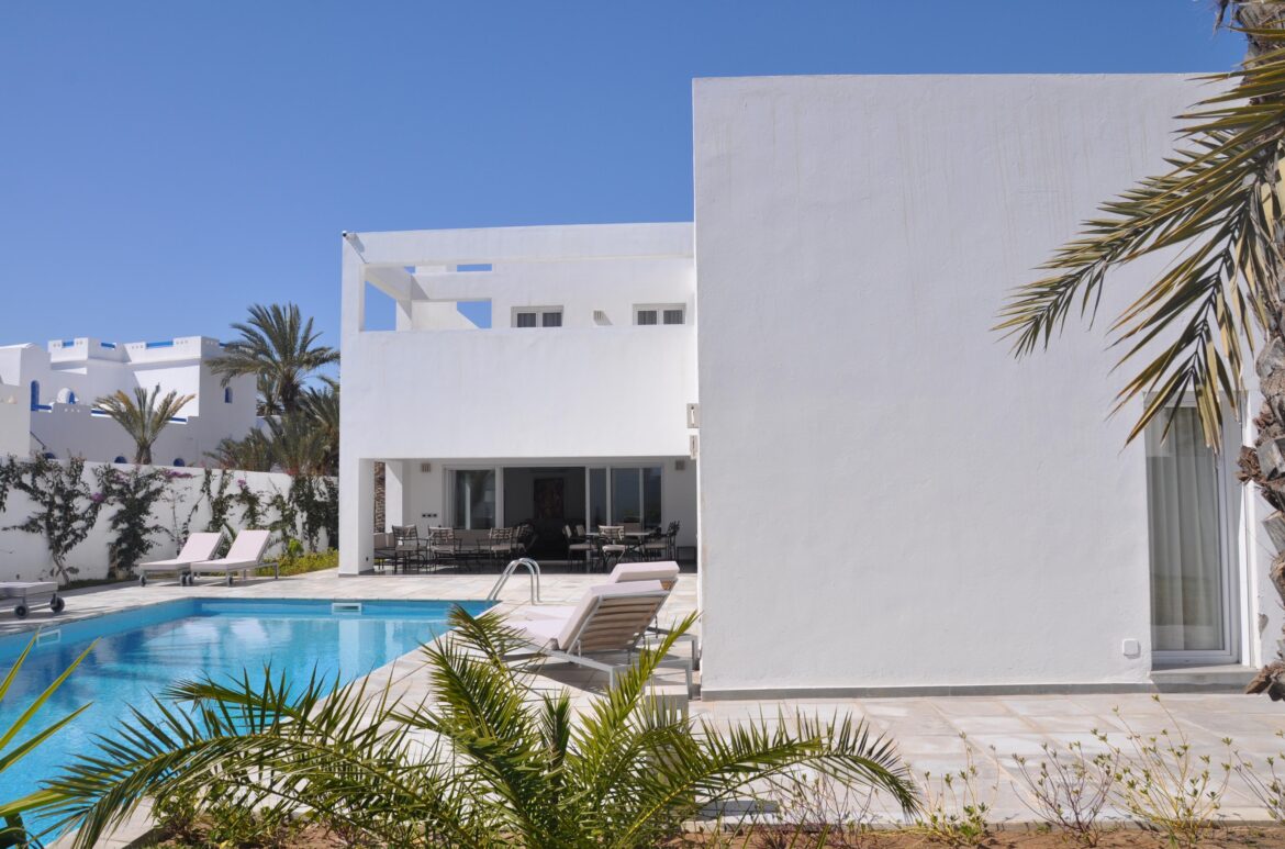 Cette villa a été construite sur une superficie de 450 m2. Des lignes épurées l’ont fondé, tout comme les anciens « houchs » de Djerba. L’architecte n’est cependant pas tombée dans le pastiche. La blancheur des formes cubiques, et le jeu d’ombre et de lumière ont caractérisé cette villa… qui se pose dans l’étendue de palmiers et d’oliviers de l’île.