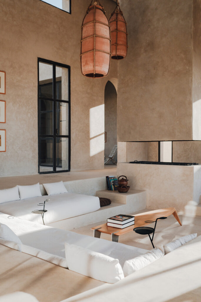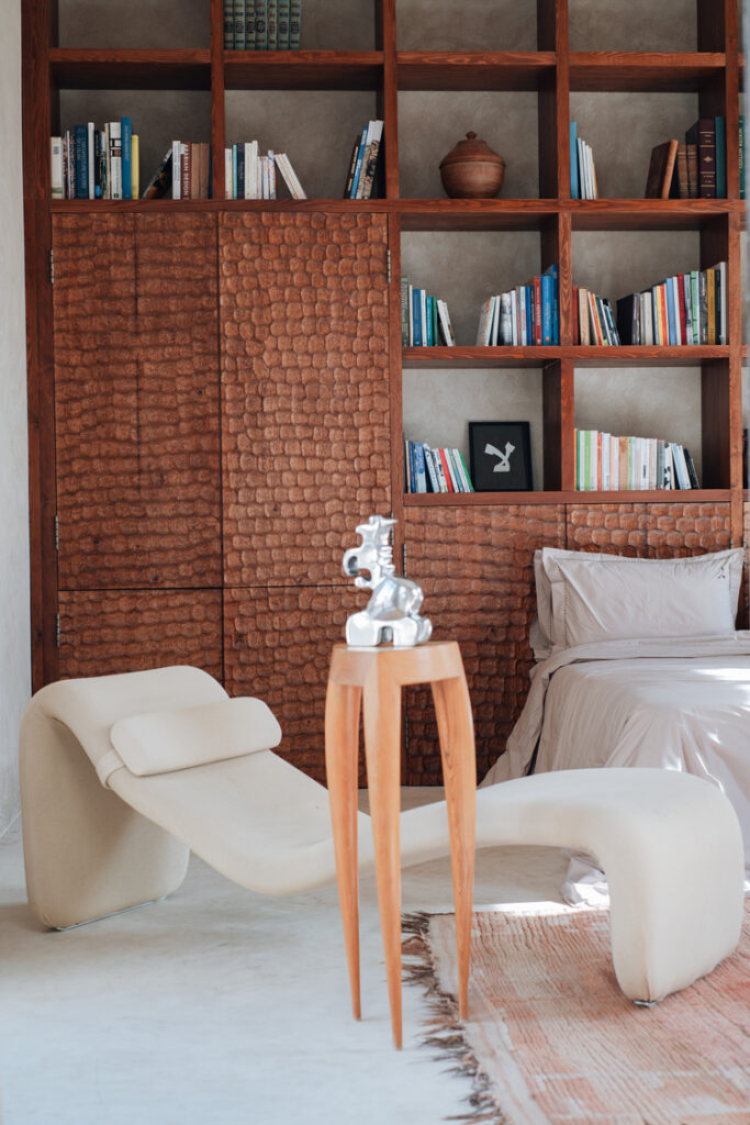 Chaque surface a été façonnée à la main, à partir de matériaux naturels et locaux. De la terre crue aux assemblages de bois sculpté, chaque détail porte l’empreinte du geste humain. L’architecture ne se contente pas d’être vue : elle se ressent, se touche et s’imprègne dans la mémoire. Nous avons étendu cette approche artisanale à l’intérieur, en commandant du mobilier et des objets auprès de designers locaux et internationaux. Ces collaborations n’étaient pas purement décoratives. Elles visaient à faire revivre des savoir-faire en voie de disparition, à donner la parole aux talents émergents et à ancrer le projet dans un réseau dynamique d’artisans.