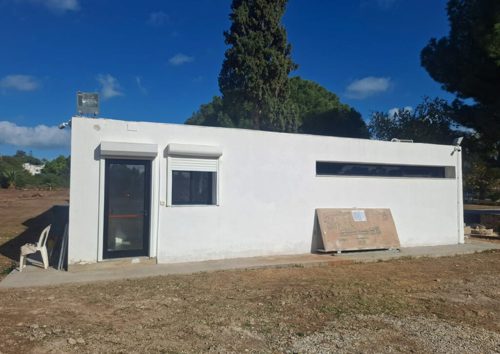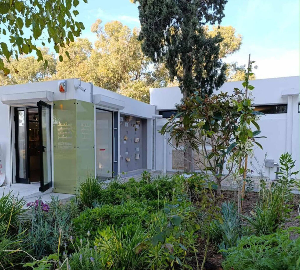 L’approche du musée est garnie par un cube blanc annonçant une ouverture vitrée pour les visiteurs. Une allée les prends en charge vers le musée, mais aussi vers le site archéologique.