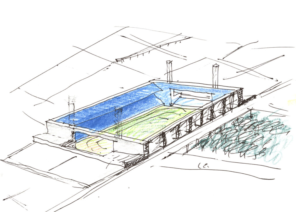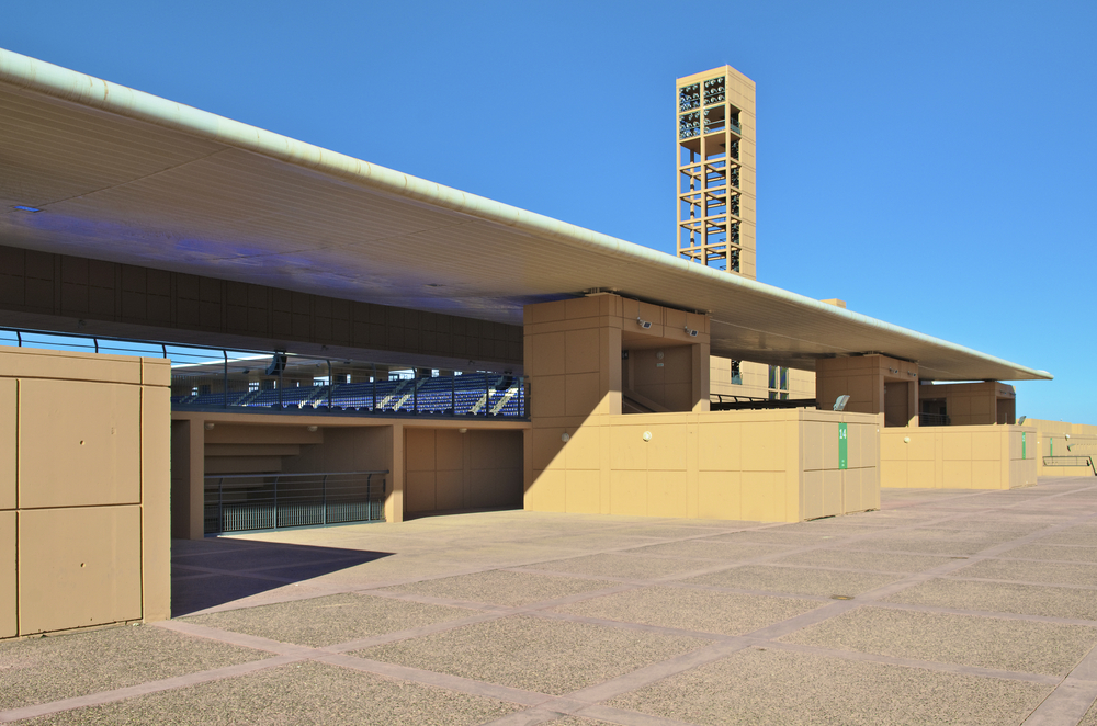 L’ensemble du terrain du stade est réglé par une trame verte composée de palmiers d’alignements et jacarandas qui ordonnent le site, les parcours piétons, les parkings et la localisation du stade d’entrainement.