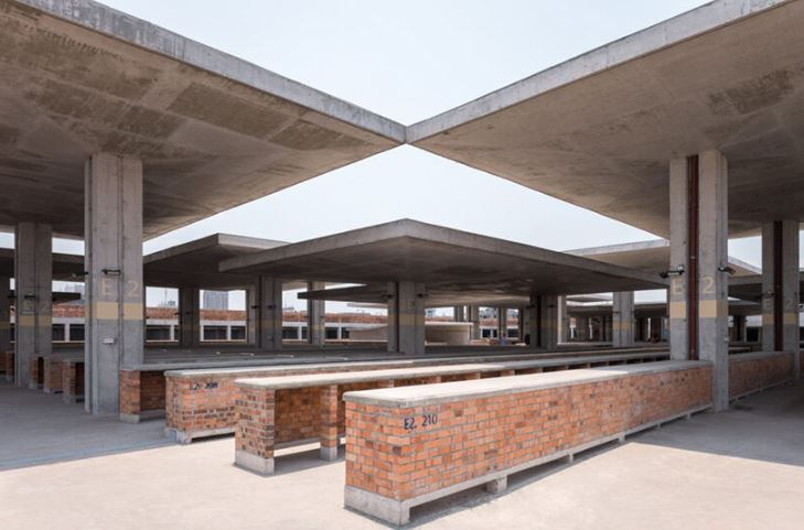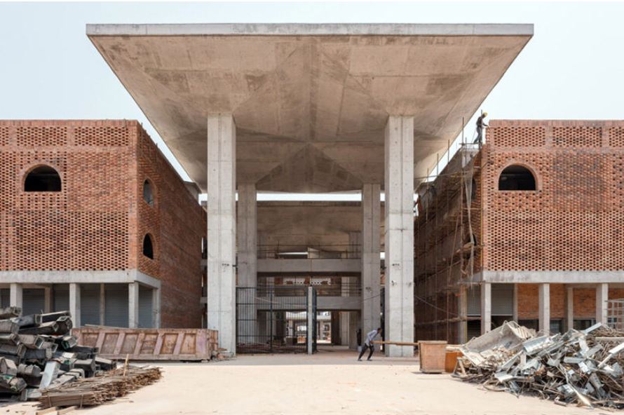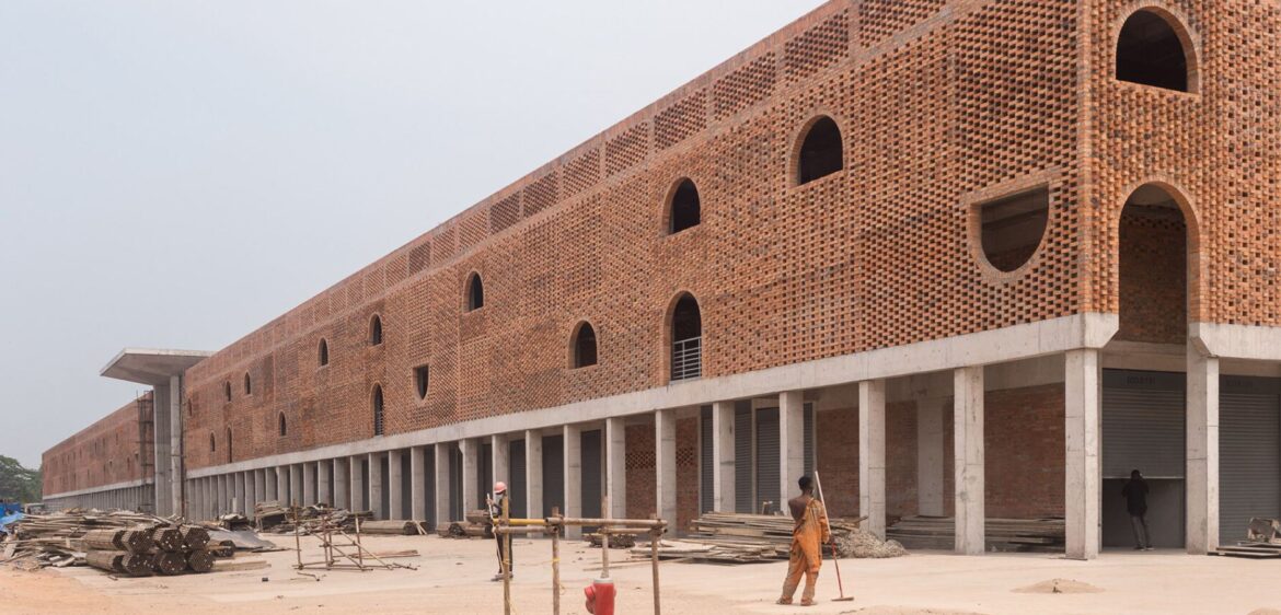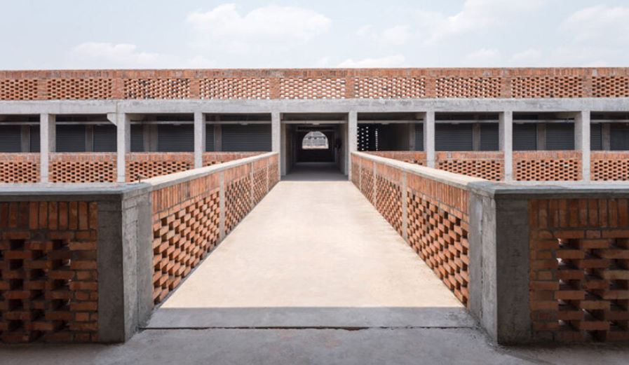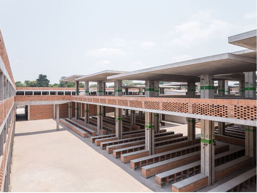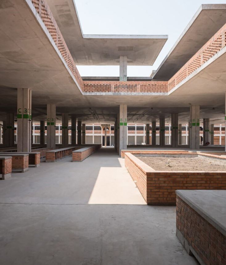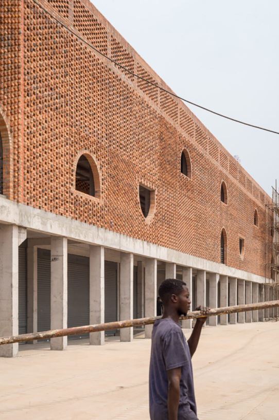 Visuellement, le design s’inspire à la fois des traditions architecturales congolaises et de l’héritage moderniste du brutalisme africain. Les dalles en forme de champignon, autrefois caractéristiques du marché d’origine, sont réinterprétées comme des éléments structurels, climatiques et symboliques. Leur géométrie procure de l’ombre, répartit les charges importantes et confère au bâtiment une identité civique forte. Les façades en terre cuite arborent des motifs inspirés des textiles wax et des tatouages, alliant ventilation et références culturelles. La couleur naturelle de l’argile locale permet au bâtiment de s’intégrer harmonieusement au paysage de Kinshasa, sans le dominer visuellement.