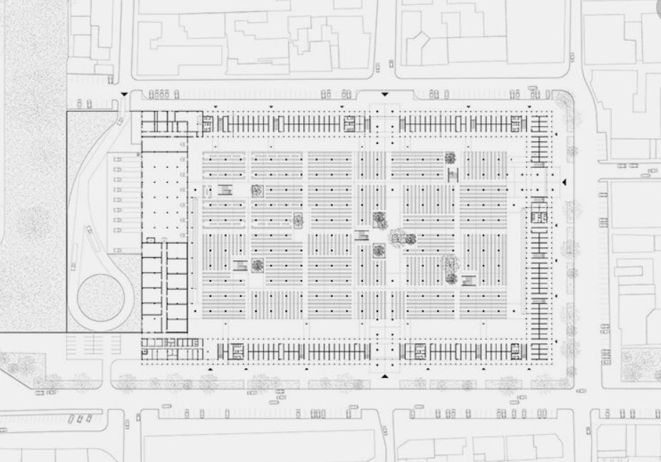 Les architectes ont organisé le plan autour de cinq cours intérieures ouvertes, introduisant ainsi végétation et lumière naturelle au cœur du vaste marché. Ces patios, plantés d’espèces indigènes, jouent un rôle de régulateurs microclimatiques, d’espaces de rencontre et de zones de biodiversité. Des jardinières sont intégrées aux balustrades et les rues avoisinantes sont bordées d’arbres, formant un corridor vert reliant le bâtiment au jardin botanique de Kinshasa. L’eau de pluie est collectée et stockée dans des réservoirs, puis réutilisée pour l’irrigation, le nettoyage et la sécurité incendie. Ce système réduit la dépendance aux infrastructures municipales tout en renforçant la résilience du bâtiment en cas de fortes pluies ou d’interruptions de service.