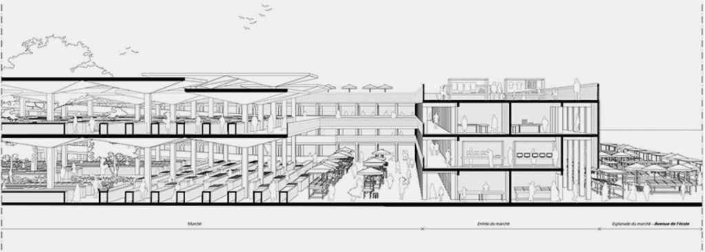 Les architectes ont enrichi le cahier des charges initial, initialement minimaliste, en un programme détaillé grâce à des ateliers réunissant les représentants de la ville, les commerçants, les pompiers et les services municipaux. Les étals, de différentes tailles, sont loués au mètre linéaire ou au mètre carré, permettant ainsi la coexistence de commerçants aux revenus variés. Les zones de commerce informel sont préservées, reconnaissant leur rôle central dans la culture urbaine congolaise.