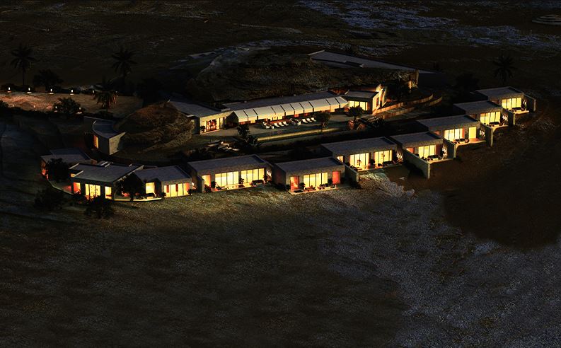 Nestled between two naturally occurring granite hills, the retreat’s master plan revolves around a carved « oasis » area that serves as both an architectural and landscape gesture. Guests can experience a continuum of enclosure and openness that is essential to desert life thanks to this central void, which acts as a hinge between enclosed hospitality facilities and the vast desert outside.