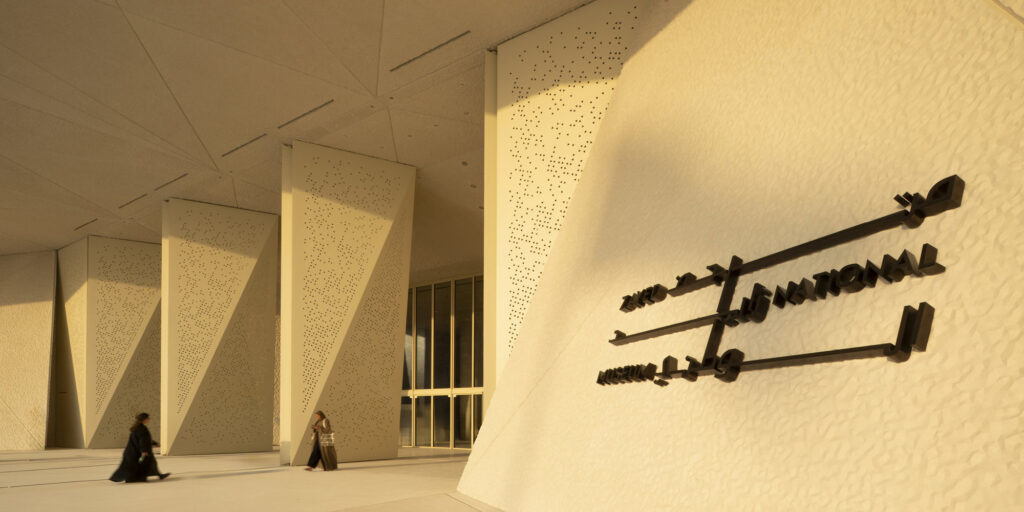 The museum spaces are located within a mound, which has textured faceted panels that are an abstraction of the UAE’s topography. The mound insulates the interior spaces from solar gain, forming a protective shield that prevents heat from entering the building. When visitors step inside the museum, they enter the light-filled atrium, or Al Liwan, which serves as both a meeting and orientation space, hosting performances such as traditional dance and poetry.