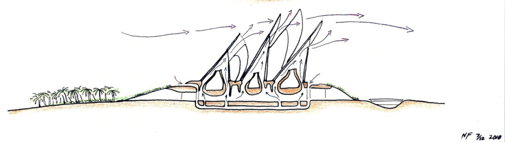 The museum’s five lightweight steel wings are part of the system of natural ventilation. Air vents open at the top of the towers, taking advantage of the negative pressure on the lee-side of the profile to draw hot air out from the atrium, assisted by the thermal effect of the heat build-up on the tips of the wings. Air that has been naturally cooled through pipes buried deep below the desert floor then flows into the atrium through a low-level ventilation system. The wings are glazed to channel natural light into the galleries below, and each one is individually tuneable.