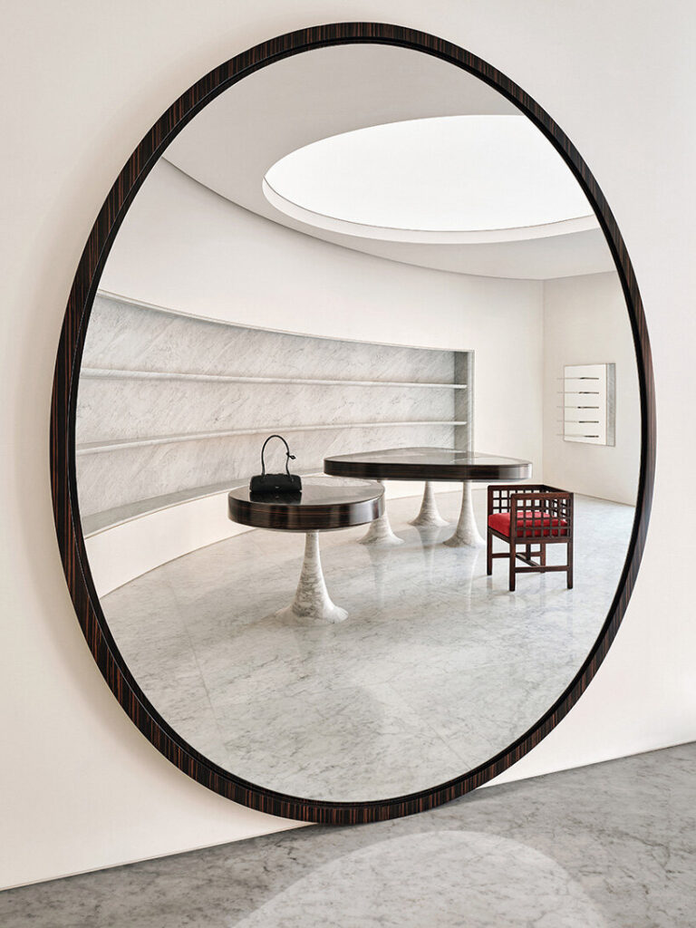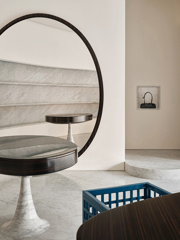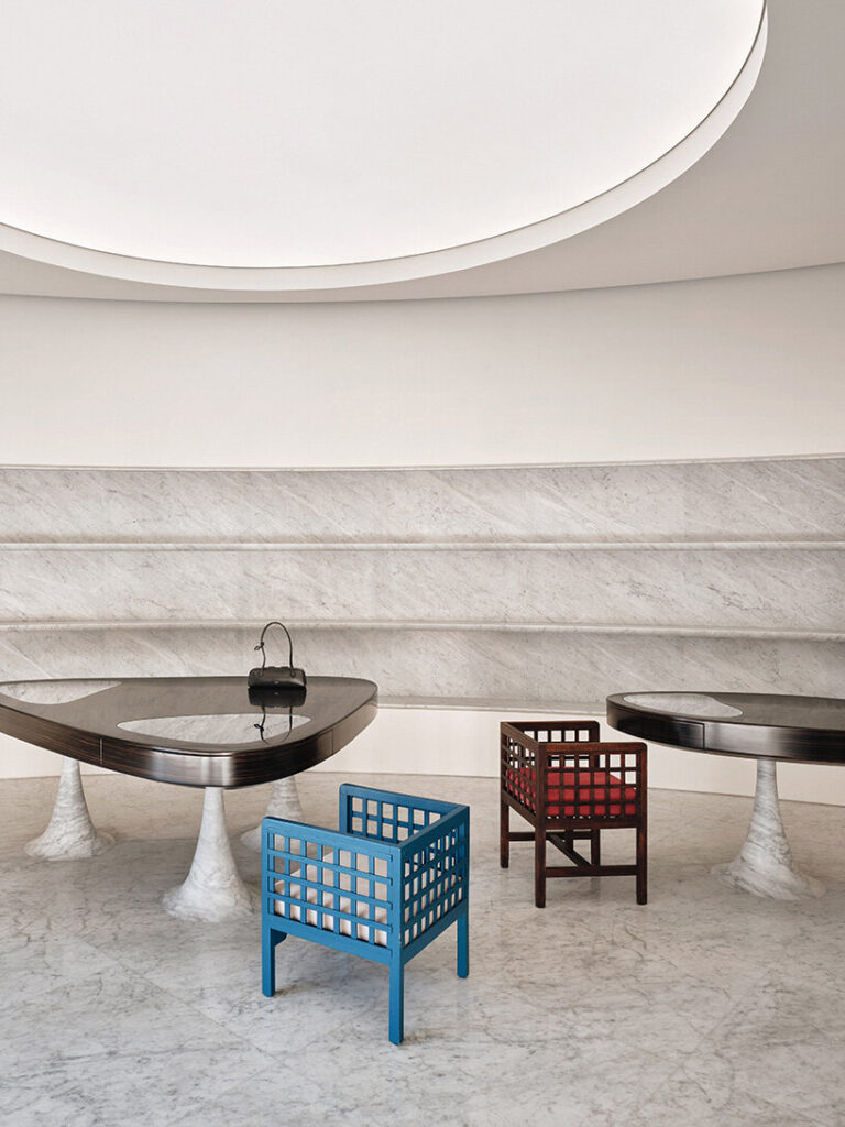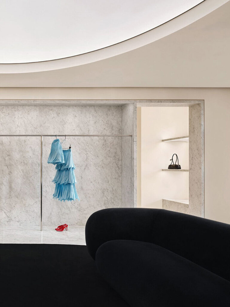 Des lignes courbes et organiques contrastent avec des formes géométriques nettes, reflétant les dualités qui définissent l’approche de la maison de couture parisienne. Au rez-de-chaussée, une imposante étagère en marbre structure l’espace, tandis que des podiums sculpturaux émergent du sol comme des prolongements sculptés de l’architecture. Le mobilier d’exposition est intégré à la composition spatiale.