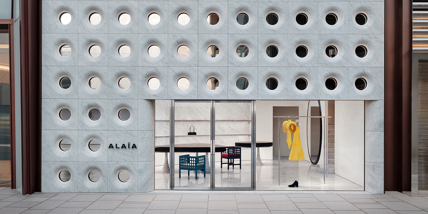 Depuis la rue, la façade, un plan massif de marbre de Carrare, est ponctuée de fenêtres circulaires et arrondies inspirées des motifs perforés emblématiques d’Alaïa. Ce rythme allége la masse de la pierre tout en préservant une impression de gravité et de sérénité. Monumentale et pourtant sobre, la façade inaugure une nouvelle expression architecturale pour la Maison, fusionnant le raffinement de la haute couture et la présence urbaine.