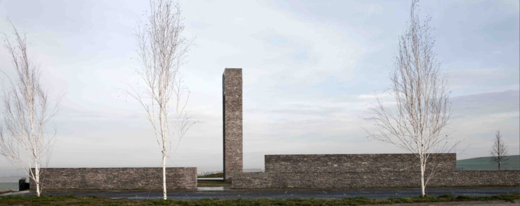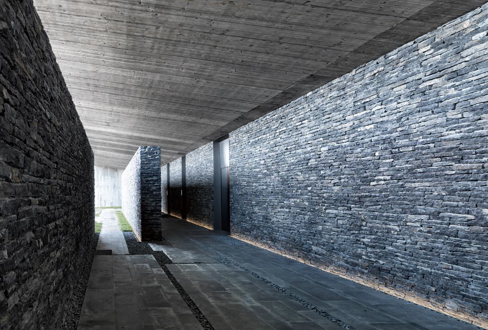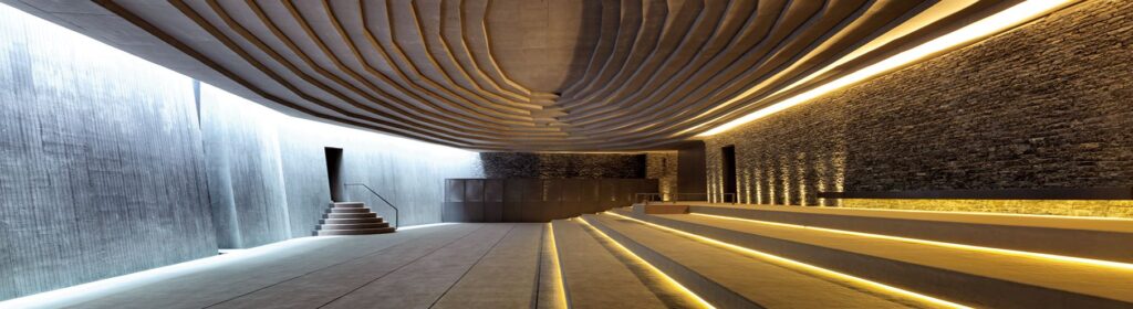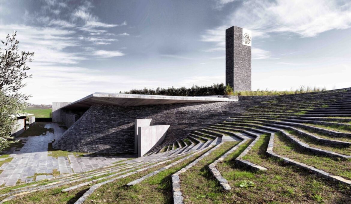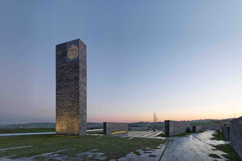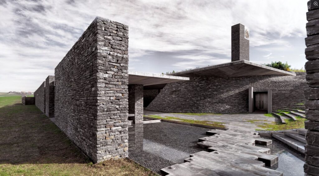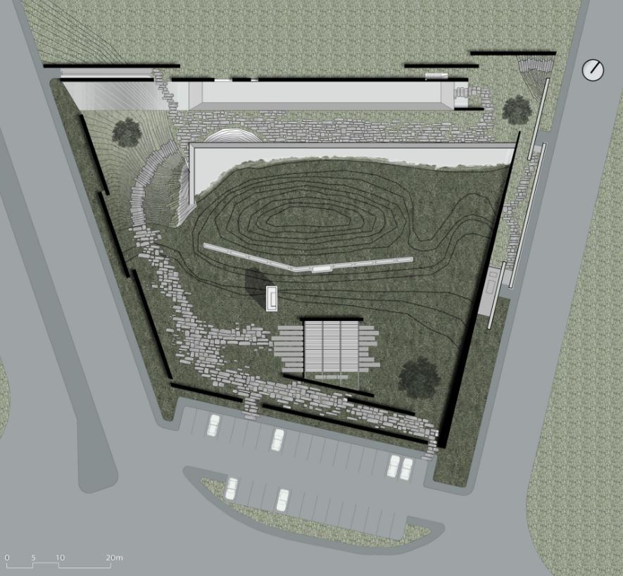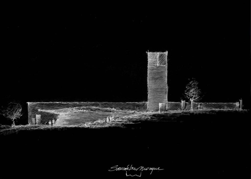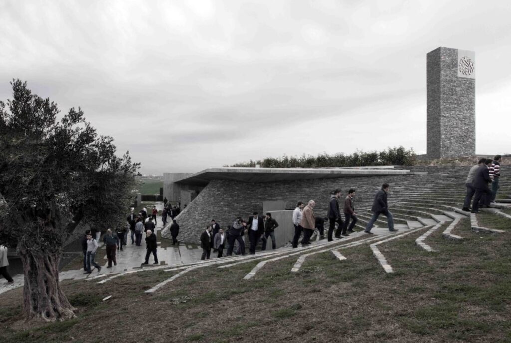 The project site is located in a prairie landscape that is separated from the surrounding suburban gated communities by a busy street. The only visible elements of the mosque are the garden surrounded by horizontal courtyard walls and a vertical prismatic mass of stone (minaret), which depicts that this is a “place.” The inscription that is clarified when one approaches enough, clarifies that this is a place for praying.