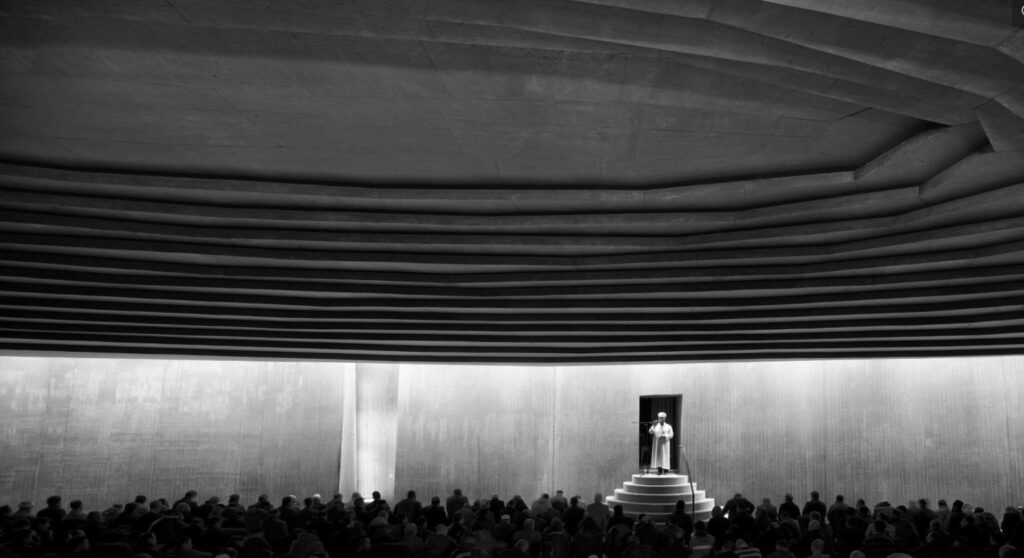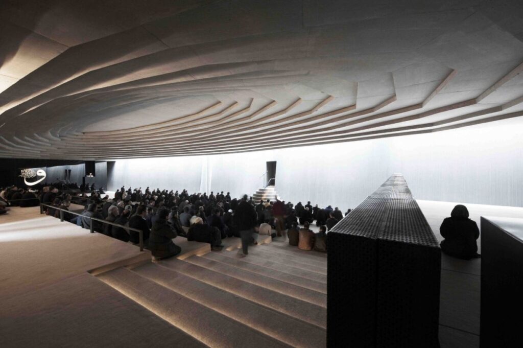 The only ornament seems to be the daylight that leaks from the Qiblah wall, changing according to the time of the day. The slits and fractures along this wall enhances the directionality of the prayer space. A very special element is the letter “waw” on the reflective black wall of infinity. First time in mosque architecture, women have the chance to pray just in the same row as the men, contrary to being at the back as in all others. They are placed at an elevated and separated part of the hall. The complex includes the ablution halls and restrooms, that are adjacent, and the imam’s house from where he can reach the hall directly.