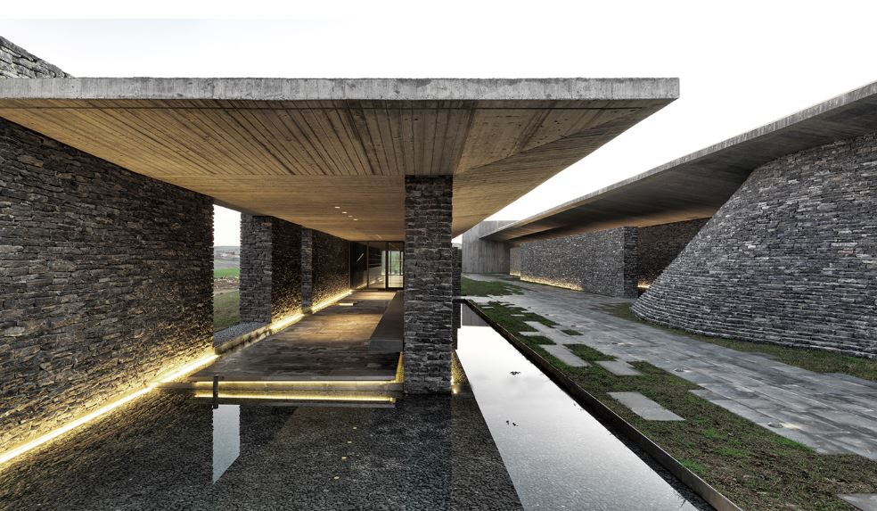 The building blends in completely with the topography and in this peaceful way, delivers back the form of the ground. This submerging feature and the green roof all above provides a natural insulation against heat loss and gain. Landscape materials are mainly of rural plants that need no maintenance and that merges with the prairie of the surroundings. All these features prevents the use of extra energy and water.