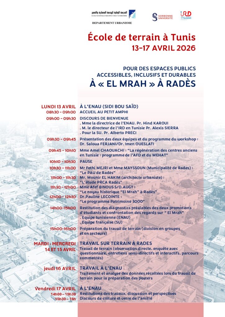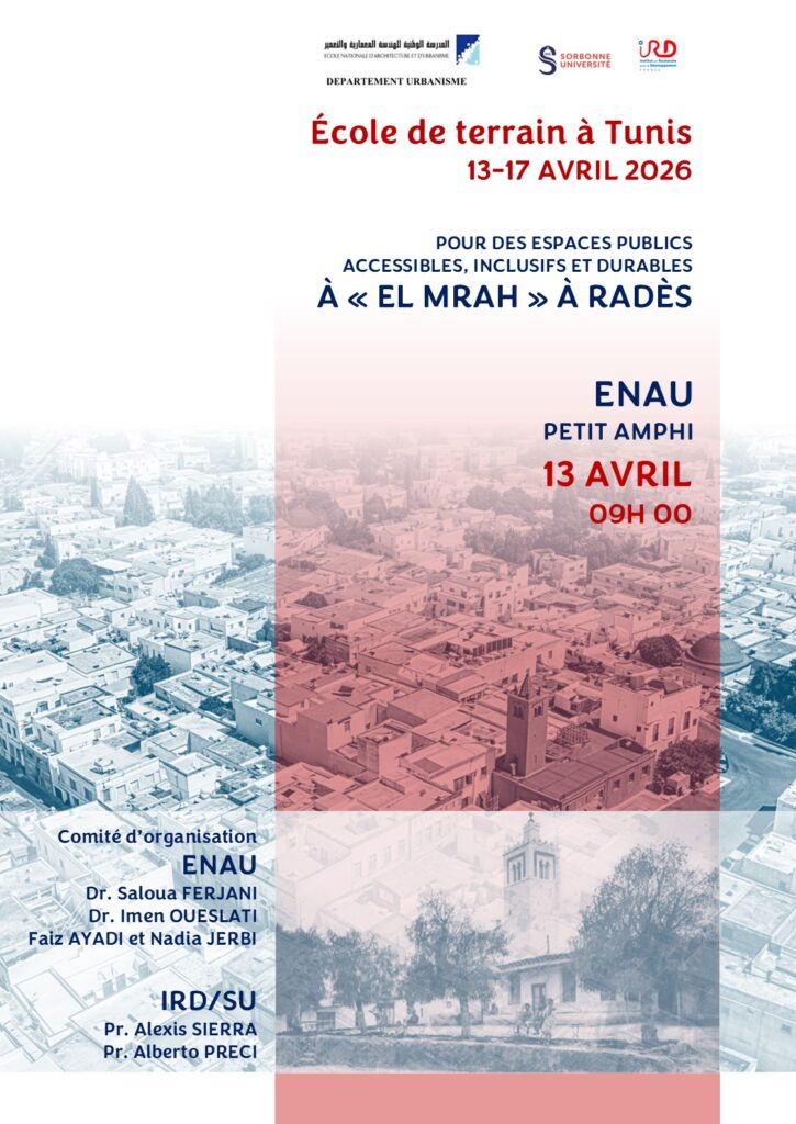 L’ENAU en partenariat avec la Sorbonne, et l’Institut de Recherche sur le Développement organise la deuxième édition d’une école de terrain à Tunis, intitulée : « Pour des espaces publics accessibles inclusifs et durables à El Mrah, Radès. »